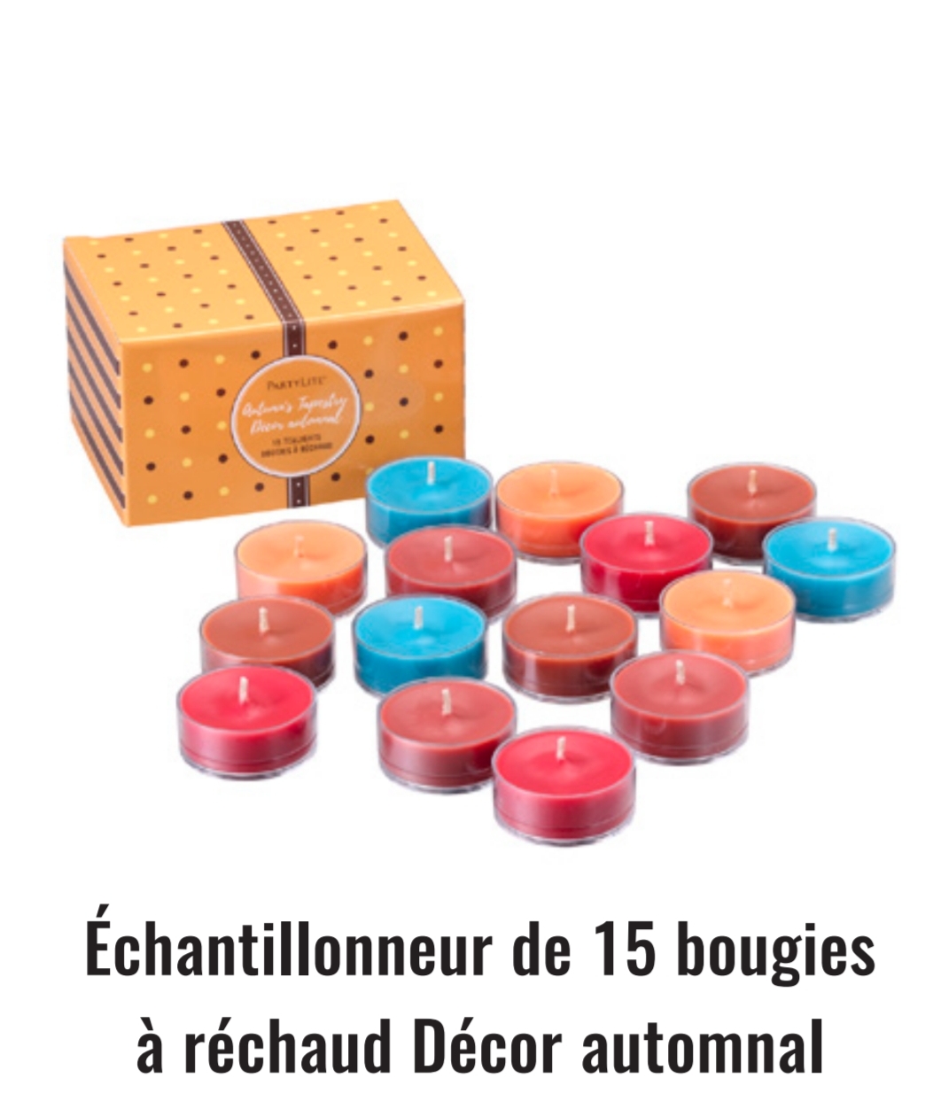 Coffret jaune : décor automnal : contient 3 bougies de chaque fragrance : moisson automnale, tournesol flamboyant, une belle journée, bois de cannelle, citrouille épicée